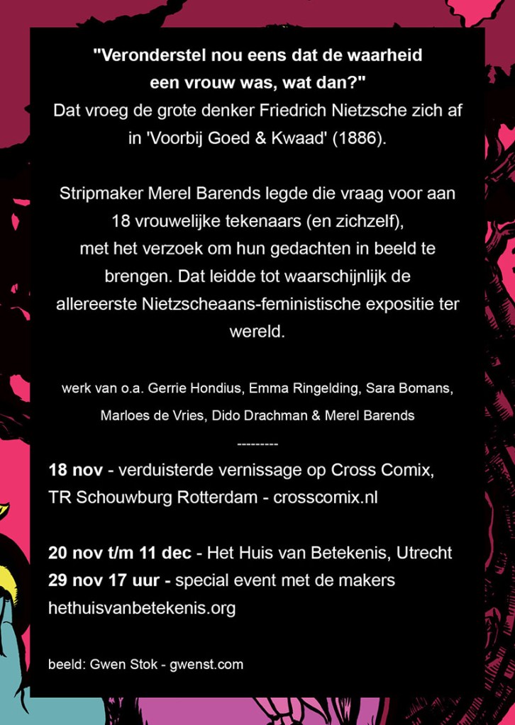 Voor Cross Comix, een stripfestival in de Rotterdamse Schouwburg, cureerde ik een expositie rond een van Nietzsche’s aforismen. Na CCX reisde de expo, die helemaal in het donker plaatsvindt en waar je met een zaklampje de werken moet bekijken, ook nog naar Utrecht.